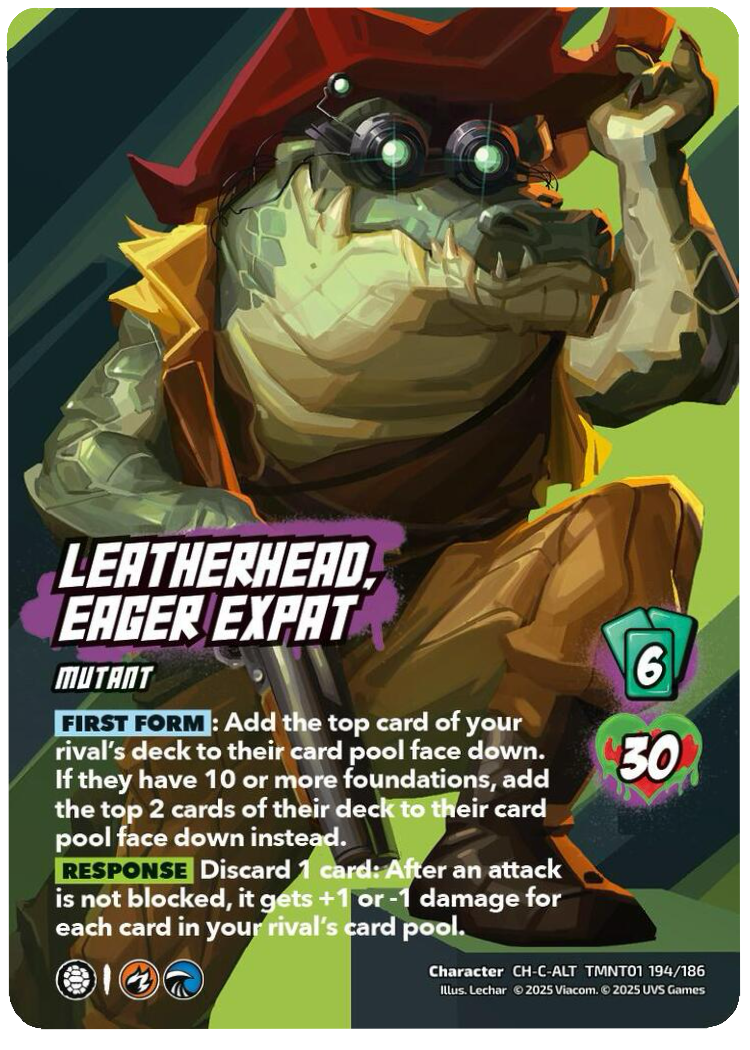 Leatherhead, Eager Expat: I loved playing Leatherhead. Punishing my opponent for building wide, giving huge damage at the end of a string, and having a good chunk of health to chew through are all big positives. The main negatives of this character for me still remain how much they struggle into decks slinging 10+ damage moves for every move, that becomes extremely hard to contend with when your biggest defense is “face tanking” moves. With that said I wouldn’t want a character with these abilities, that also has crazy defensive abilities on face or on symbol to exist within the game but it does limit Leatherhead.