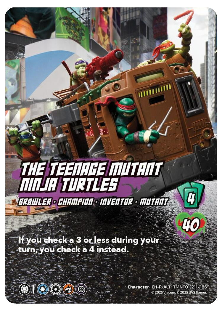 Retro Teenage Mutant Ninja Turtles: Ummm…. These guys are just awful. UVS Games did a great job of giving me a reason to want to buy a couple copies of the Starter Deck product for this set unlike the Heroes of Exandria and Attack on Titan versions of the product, but this character is not one of them. The cards exclusive to the Starter are cool, some like the Splinter Backup are even good. The retro art treatment on cards in the set is amazing. This character should not have been printed. I get wanting an “easier to learn” entry level product, that’s low cost, I don’t get giving that entry level customer an unplayable character. One ability, even this particular ability is fine, but why did they have to be a 6 hander with 22 health? Couldn’t they have made them a 7 hander with 22 health, or a 6 hander with 30 health? It wouldn’t have made them crazy but would have made them at least not feel quite as awful to go join a locals for the first time with a precon to learn and see what the game is about. I really hope they either make these $15 starters slightly better or just admit that the $30 Challenger decks are the ACTUAL starter decks and abandon these entirely going forward.