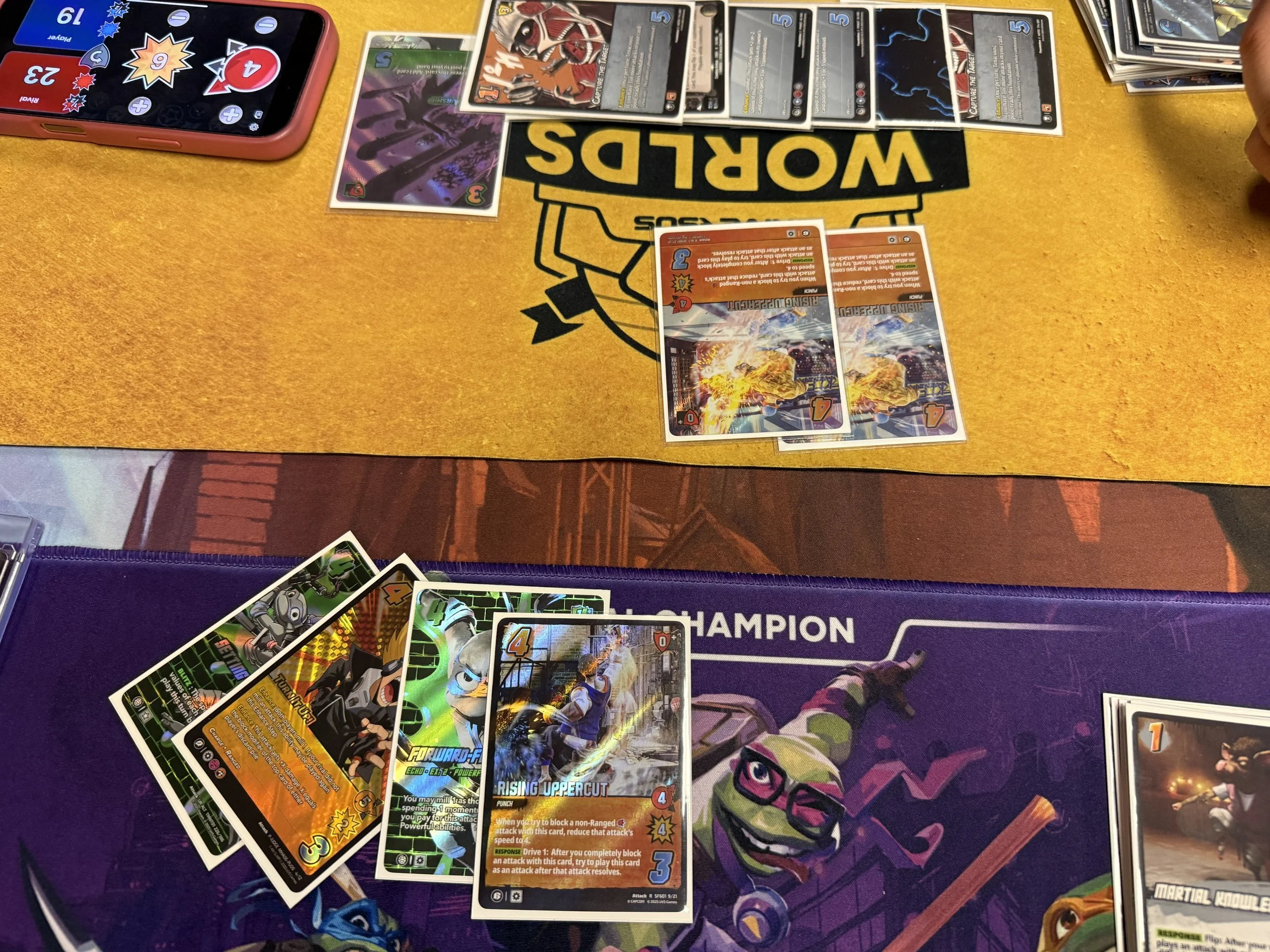 Round 2 was against Mt Lady II, so basically Godzilla a second time just with more steps. Game one I was able to hit them with a 14 damage Rising Uppercut on their turn after hitting all of my mill buttons and committing all of my damage buff foundations knowing they couldn’t crack back or block if they wanted to be able to build at all. I still lost game 1 but it didn’t feel as unwinnable as Godzilla. Game 2 I took 3 turns in after going first and getting to build out, poking with Uppercut on their turn if they dared to attack. I strung Setting the Standard into multiple Forward Flip Slashs, and Merciful Volleys, ending the game with a Turn It Up that had them mill 8 foundations in a row. I swiftly lost game 3 to a Godzilla level string of attacks with +3 damage each/ Ending Round 2 in a 1-2 loss.