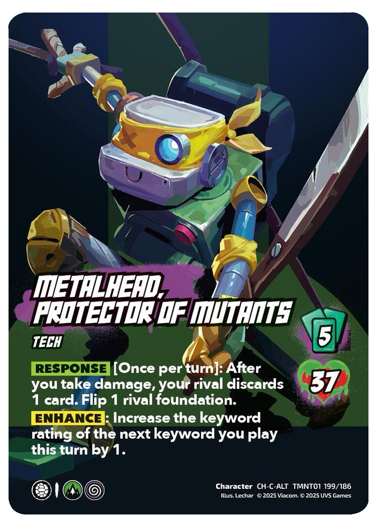 We are back with our second entry in Playing Every TMNT Character for the week! Saturday, I played Metalhead, Protector of Mutants on the Earth symbol. Earth offers lots of draw power in things like Electric Moth, Battle Aura Release, Ferocious Attacker, Big Appetite, and many more, as well as good stun and breaker abilities like Gargantuan Grapple and Earthbreaker. The idea behind the deck is to stun out their board on our turn making it difficult to block and use damage reduction to take small amounts of damage and flip their board with our response while using our enhance to power up breaker abilities to end their strings early.