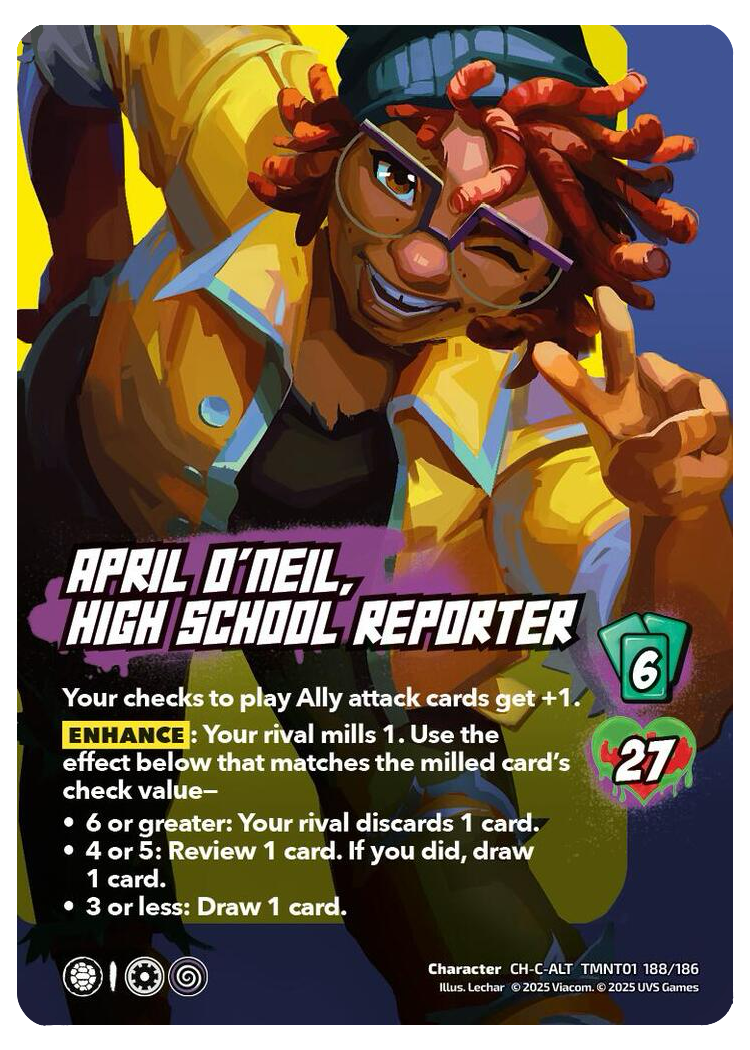 Hello! Welcome back to Playing every TMNT Character at Undefeated at Locals. This week I played April O’Neil, High School Reporter on the Void symbol. I chose Void simply because the Ally attacks on All are basically nonexistent, they aren’t much better on Void but at least it gives access to The Lurkers Strike. This was an interesting deck to play, I feel this character would be WAY better with a different symbol, which I feel is a common problem in this, and many recent sets that I plan to give more of my thoughts on in a future article after I finish up this series.